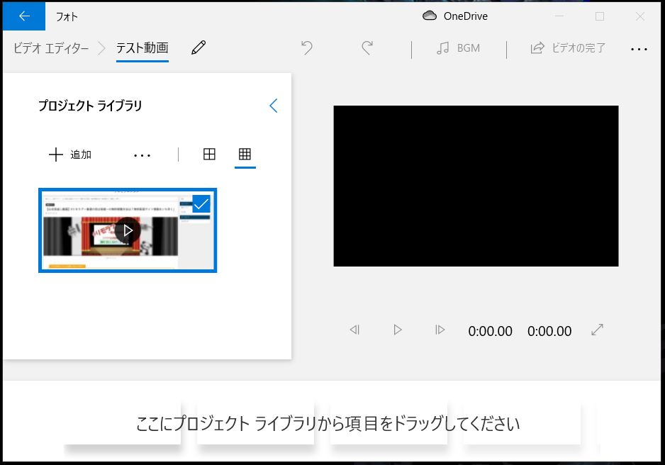 動画を「ここにプロジェクトライブラリから項目をドラッグしてください」にドラッグ&ドロップしてください。
