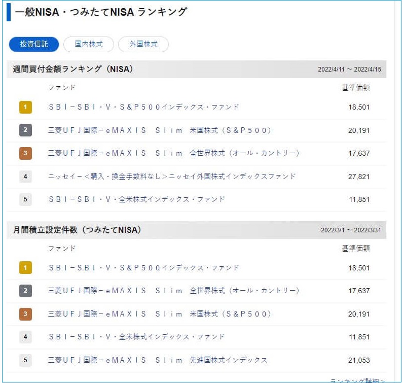 メニューにある「NISA、つみたてNISA」をクリックして、下にスクロールするとランキングが表示されます。