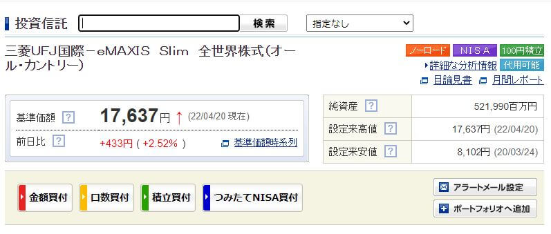 今回は例として「三菱UFJ国際-eMAXIS Slim 全世界株式(オール・カントリー)」で説明します。