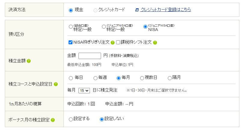 さまざまな入金方法があるのですが、ジュニアNISA口座は2023年分までしか積み立てできませんので、一括で入金するか毎月入金するかがいいかなと思います。