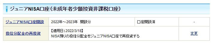 画面を下にスクロールしていくと「ジュニアNISA口座(未成年者少額投資非課税口座)」という見出しがありますので、ここで再投資になっていなければ変更しておきましょう。
