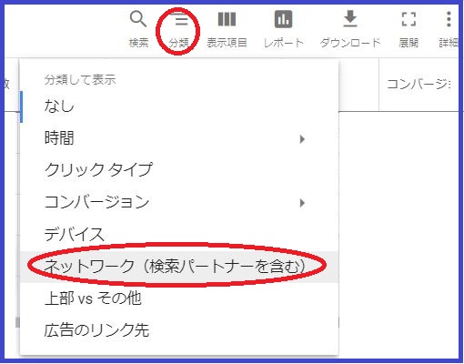 検索パートナーに配信するか否かはキャンペーン単位でしか変更できませんが、確認するときは広告グループ単位にしています。