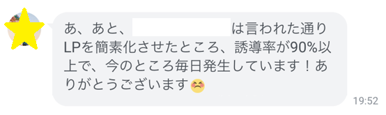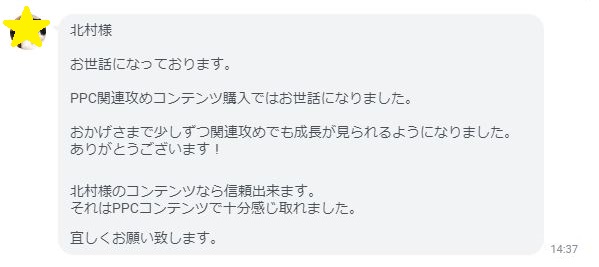コンテンツを購入していただいて見事に成果を出されている方から、べた褒めのコメントがあったので貼っておきます笑