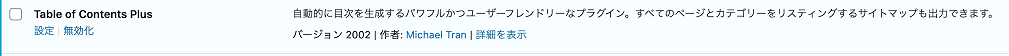 【プラグイン】→【インストール済みプラグイン】を選択後、Table of Contents Plus の設定をクリック。