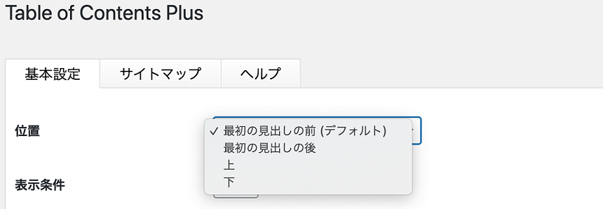 表示条件は、見出しが何個以上ある場合目次を生成するかを設定する場所です。