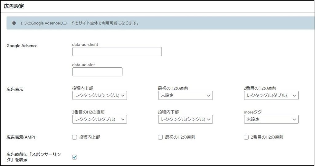オススメWordPressテーマのDIVERだと簡単にオンオフ、設置したい広告タイプを選択できます。