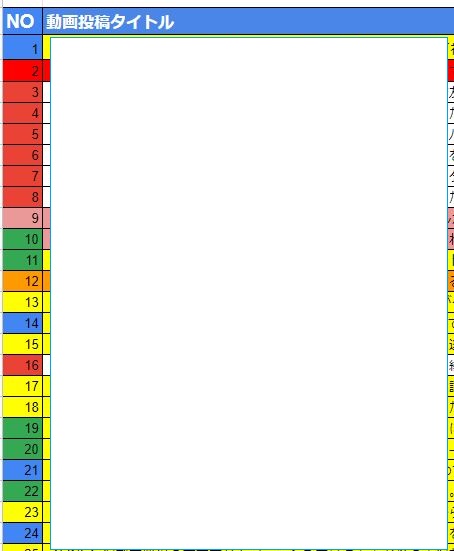 僕は動画をGoogleスプレッドシートで管理しているのですが、このようにNOセルの色を再生回数別で色分けをしています。